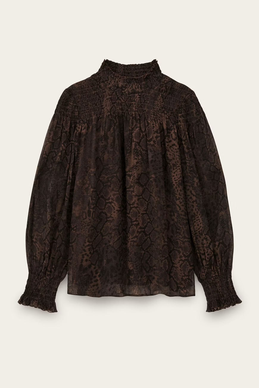 - Loose fit- Flowing material- High neck- Long puff sleeves- Lined garment except for sleeves- Smocked effect at cuffs and back- Sleeves with gathered cuffs- Snake print