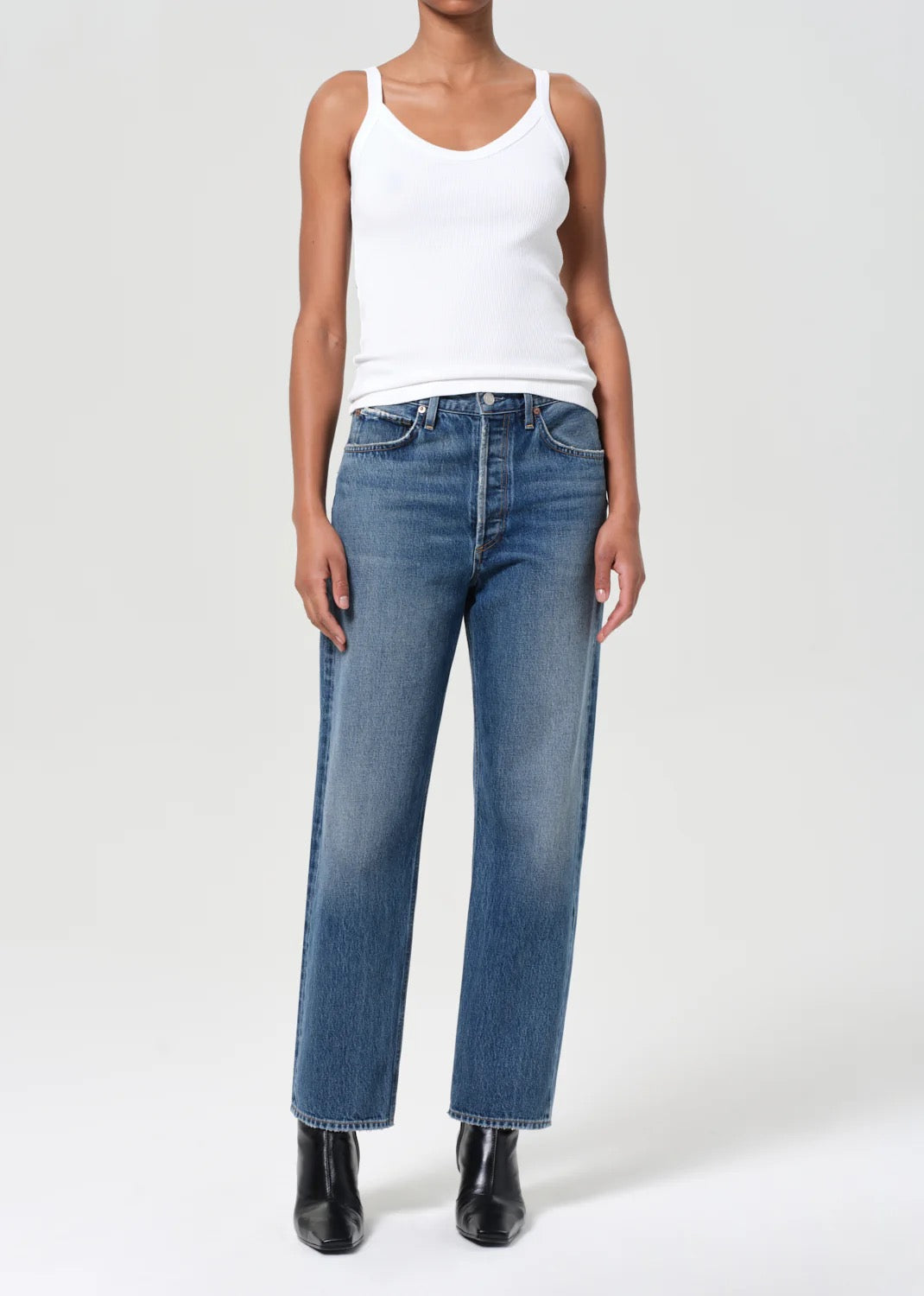 Agolde's best-selling 90's Jean in medium vintage indigo with subtle fading, marbling, and whiskering details. This decade inspired mid-rise is designed to sit relaxed at the waist with an easy fit through the hips into a classic, loose straight leg. Style back to anything and everything.