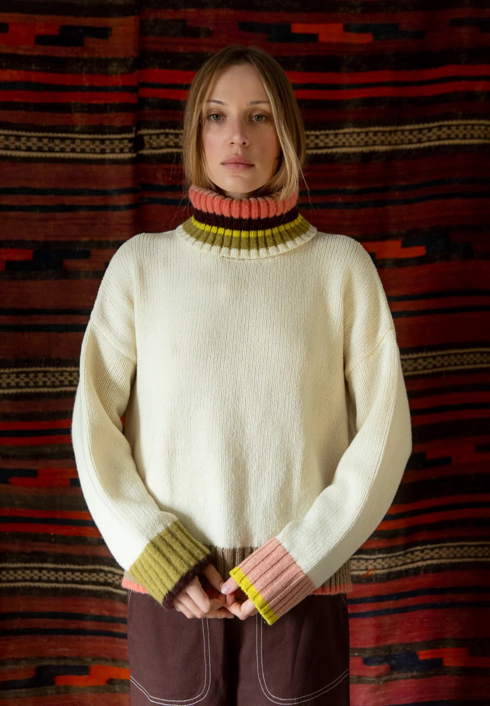 The Bailey is a timeless roll neck style knit with a modern + striking striped collar detail in a responsibly sourced yarn. Its relaxed silhouette and roll neck make it the perfect cold-weather staple, while the contrast trim at the hem, cuffs and neckline adds a unique pop of colour. This style is meant to be worn oversized, but can be sized down for a neater fit.